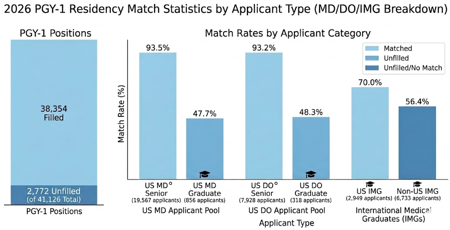 For International Medical Graduates (IMGs) navigating the residency application process, knowing which specialties offer the most opportunity can make all the difference. The National Resident Matching Program® (NRMP®)’s Advance Data Tables for the 2026 Main Residency Match reveal which specialties filled the highest share of their positions with US and non-US IMGs, a reliable signal of where IMG applicants are most competitive. But before diving into those fields, it helps to step back and look at the overall match statistics for context.
